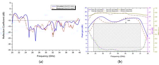 The simulated and measured (a) reflection coefficient of the proposed antenna and (b) peak gain and axial ratio at hc = 5.3 mm.