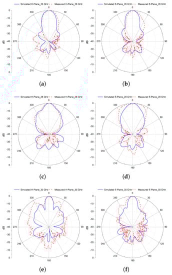 Normalised simulated and measured radiation patterns in the H− and E−planes at 26 (a,b), 28 (c,d), and 30 GHz (e,f) of the final 2 × 2 Sub-array CP antenna.