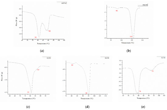 Melting profiles of LCs employed: (a,b) show the melting profile of A6zA2 and A6zA6, respectively, these are the monomer LCs used for the mixtures. (c) Melting profile of LC81 that does not show any nematic range, possibly because it is covered by the isotropic temperature. (d) Melting profile of LC18: in this case, again the isotropic temperature covers the nematic range. (e) Melting profile of LC11: in this case, it is possible to see the nematic phase between the two melting temperatures, indicating a range centered around 84 °C.
