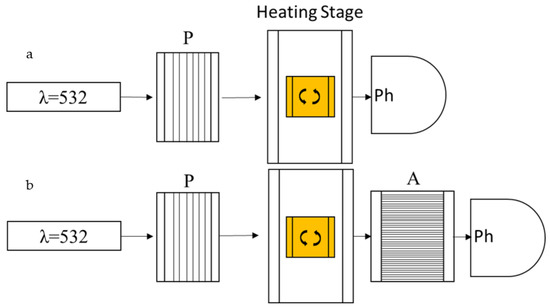 In particular, the cell reactors are infiltrated with the monomer mixtures in isotropic conditions (98–110 °C), in the absence of the initiator. Subsequently, the transmittance of the mixtures is measured between 75 and 100 °C with a rate of 0.5 °C/measure, using a 100:1 polarized laser with a wavelength of 532 nm (Figure 2a). The laser wavelength is chosen to avoid, as much as possible, the trans–cis isomerization of the azobenzene, and to have, at the same time, an appreciable absorbance. The transmitted light was measured with a power meter and converted in percentage, considering, as reference, the transmittance of an empty cell. Additionally, to evaluate the order state of the melted monomer mix, the measurements were performed with the director both parallel and orthogonal to the table. To precisely determine the polymerization temperatures, the maximum light-transmittance was measured with the cell between two crossed polarizers. Using this approach when the LC cell is rotated of 45 degrees in respect to the polarized light, and the LCs are nematic, the polarized light is rotated, and rotated again by the second polarizer, then having a maximum peak of transmission. In case the cell is in an isotropic state, or parallel to one of the two polarizers, the light is not rotated and cancelled by the second polarizer.