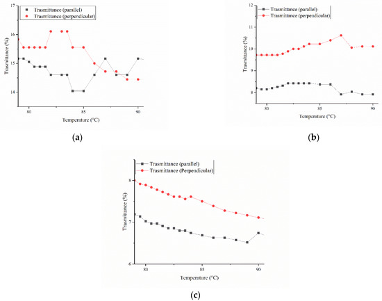 These measurements were performed for all formulations to investigate the effect of the ratio between linear (L) and cross-linker (C) monomer on the LCs organization. In Figure 3a–c, we report the transmittance measurements for the three mixtures. First, the mix with a ratio of 8:1 (LC81) was measured. Interestingly, the transmission of light polarized parallelly and perpendicularly shows an opposite trend between 87.5 °C and 80 °C, indicating that in that range of temperatures, the mixtures of liquid crystals arrange from an isotropic to a nematic to a crystal phase. During the cooling, the transmittance signal decreases around 85 °C (Figure 3a) when the director is parallel to the laser polarization, showing that the molecules are recrystallizing from an isotropic state towards the nematic phase. For this reason, order state calculation was performed to pinpoint the current nematic temperature range. Consequently, the order state (S) calculations increase for the LCs in the range between 81.5 and 84 °C (Figure S2a in Supplementary Materials). To narrow this range down, an analyser was set parallel to the optical table between the heating stage and the power meter (Figure 2b). When the polarization of the laser and the axis of the analyser are perpendicular, the power meter shows a minimum in transmission, as long the nematic director of the cell is parallel to one of the two directions. When the cell is rotated 45 degrees instead at the isotropic–nematic transition, the maximum temperature in transmission is recorded. This happens because the liquid crystals induce a rotation to the polarization axis of the light. In fact, we found that only at 83, 82, and 81.5 °C does the mixture have a higher order state (Figure S2b in Supplementary Materials).