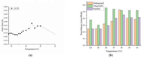 For the nematic phase, the order state can be defined as the preferred direction and a degree of order of the liquid crystals []. Such parameters can be used as a quantitative tool. Due to the opacity of our PMPs, we use them not as a quantitative method, but as a qualitative method, to narrow down the range of temperatures. For this reason, the S was used together with the transmittance of the LCs to pinpoint precisely the nematic temperature of the mixture.