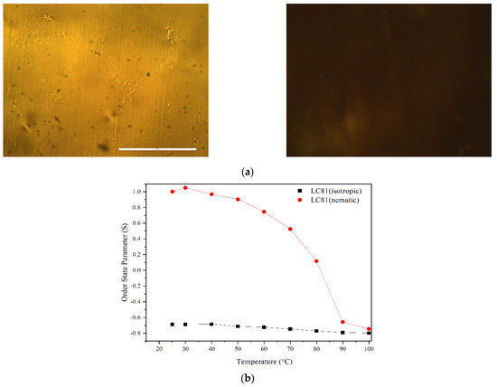(a) Polarized microscopy images of LC18, showing the birefringence properties of the materials. The bar represents 200 um. (b) Order state parameter of LC81 measured at various temperatures (probe wavelength λ = 633 nm).