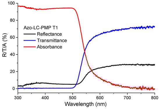 The optical properties of PMPs were also investigated by spectrophotometric analysis. In Figure 6, the transmittance (blue line) and the reflectance (black line) measured for a PMP film with a thickness of 50 µm are reported. The absorbance of the film is successively calculated using the well-known relation A(%) = 100 − T(%) − R(%), and represented in the same figure with a red line. The absorbance estimated is higher than 90% in the wavelength range UV/VIS 200–500 nm, then the values decrease quickly to a few percentages in the near-infrared region (Figure 6). These results show how a laser source with wavelength of 457 nm can be an optimal choice to investigate the behavior of the film bending, because of the absorption of optical energy. Interestingly, the PMP shows reflectivity up to 30% after 550 nm. This effect is probably due to various factors. Polymeric material glossiness is related to its smoothness []. Probably, because of our preparation/polymerization procedure, the material does not show much reflectivity, since the rubbing causes the formation of a very rough surface. Another factor is correlated to the presence of azobenzene, which in our analysis condition, shows a light orange color. Azobenzene, even in different conditions than ours, was previously used to switch optical properties of liquid crystals mixtures and elastomers [].