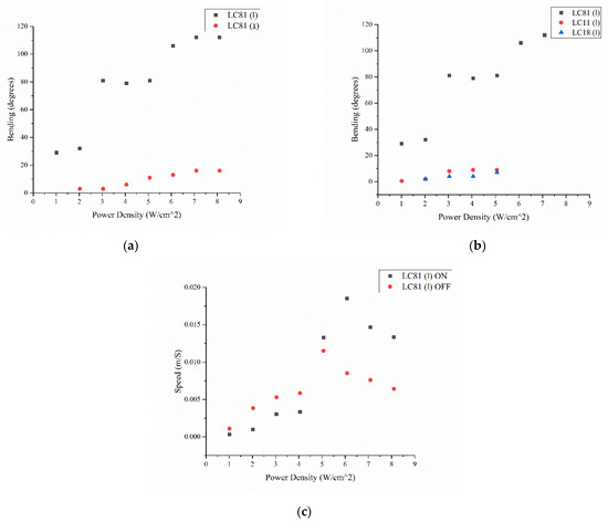 (a) Bending of LC81 when irradiated with polarized light parallel and perpendicular to the rubbing direction, (b) bending of LC81, LC18, and LC11 irradiated by polarized light parallel to the rubbing direction, and (c) bending speed of LC81 when the laser is ON and OFF.
