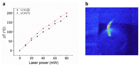 Finally, we investigated the thermal response of the LC81 PMPs by thermographic analysis when irradiated with a laser wavelength of 457 nm. In Figure 9a, the maximum temperature increases (ΔT) that the film reaches in the range 0–80 mW are shown, considering both parallel and perpendicular laser polarization. As visible from the graph, the temperature trends achieved for the two different polarizations are similar, and can be considered quite linear with respect to the laser power. The temperature values with parallel polarization are only slightly higher than those measured with the perpendicular polarization. These results relate to the thermal behavior of the sample, and do not justify the differences in mechanical response (Figure 7b) associated with the two laser polarizations, indicating how the thermal effects do not play a predominant role in the film’s movement. In Figure 9b, an example of a thermal image acquired during the measurements is shown.