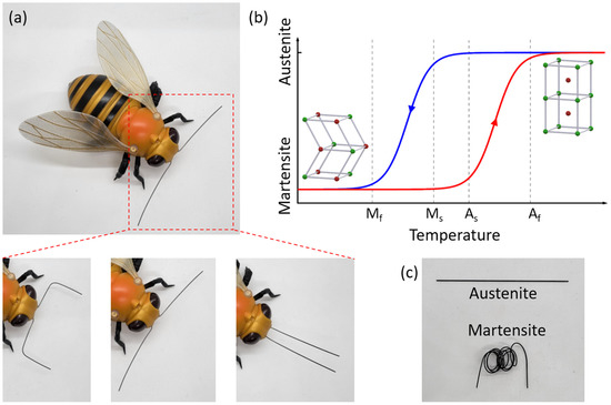 SMA are metals that have a memory effect depending on environmental temperature. Most SMAs are alloys made of nickel and titanium. At low temperatures, the SMA is in its martensite state. Atoms are loosely patterned in this state so that the shape of SMA can be easily modified. While at high temperature, the SMA is in the austenite state, where the atoms are tightly arranged, making the whole SMA stiff and rigid. When the temperature crosses the threshold level, the heat absorbed by the SMA is sufficient for its crystal structure to rearrange, generating strain within the material and allowing it to recover to its preprogrammed shape, regardless of its previous deformed shape, which represents the inherent memory of the SMA [40,41]. Due to the hysteresis of the SMA, the threshold temperatures of state-change are different for increasing and decreasing temperature [42,43]. As shown in Figure 1b, the start and end temperatures for the state-changing from martensite to austenite are As and Af, respectively; the start and end temperatures for the state changing from austenite to martensite are Ms and Mf, respectively [44]. Figure 1c shows the photo of SMA wires in austenite and martensite states.