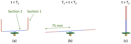 The design of the ShMoA tunes the return loss of an antenna based on its configuration; it consists of two SMA wire arms, as shown in Figure 2. Each arm comprises one red color section made of an SMA exhibiting a low-temperature threshold at T1 and one blue color section fabricated with an SMA with a high-temperature threshold of T2. When the temperature is less than T1, the whole sensor is manually reset to the shape shown in Figure 2a. When the temperature rises above T1, the red section recovers its predefined shape as a straight line, which results in a dipole antenna configuration, as shown in Figure 2b. The shape reconfiguration alters the radiation profile of the antenna and, consequently, its reflected S-parameter S11. Even if the temperature drops below T1, the antenna still holds the dipole antenna configuration. This can be used to ensure antenna design is robust to temperature fluctuations. The antenna can also be reconfigured to another shape beyond a temperature crossing event above T2. When the temperature is higher than T2, which indicates a further temperature crossing event, the blue section recovers its predefined straight shape, as shown in Figure 2c. This causes the sensor to form a parallel line configuration. An antenna with parallel arms does not radiate as the antiparallel currents in the two arms result in radiation that cancels out. Similarly, if the temperature drops below T2, the antenna still holds the parallel line shape. The historical temperature information can be known by sensing the radiation profile by measuring S11. Alternately, for applications in wireless communication, the temperature can be used as a stimulus to control the antenna configuration and its impedance (folded, dipole, etc.).