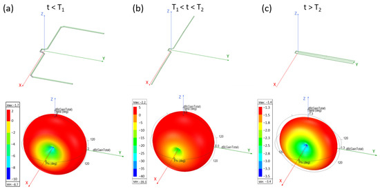 Simulated 3D radiation pattern of the ShMoA and corresponding antenna geometry at (a) t < T1, (b) T1 < t < T2, and (c) t > T2.