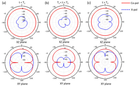 Simulated radiation pattern of the XY plane and XZ plane of the ShMoA at (a) t < T1, (b) T1 < t < T2, and (c) t > T2.