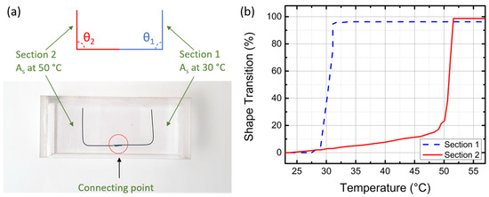 Figure 6b shows the shape transition percentile of the two sections while the temperature increases from 20 °C to 60 °C. Initially, both sections are manually set to be 90°, which corresponds to a 0% shape transition. When the temperature is above their thresholds and the SMA wires become straight, the angles become 180°, which leads to a 100% angle transition. Section 1 has a threshold of around 30 °C, and Section 2 has a threshold of about 50 °C. In Figure 6b, the measurement temperature response of Section 1 is depicted as the blue dashed line. The shape of the SMA wire starts to change at 28 °C and finishes changing at 32 °C, resulting in a 4 °C transition zone. Similarly, the measured response of Section 2, shown as the solid red line, starts to drastically change shape at 48 °C and finishes changing at 53 °C. The transition zone is 5 °C.