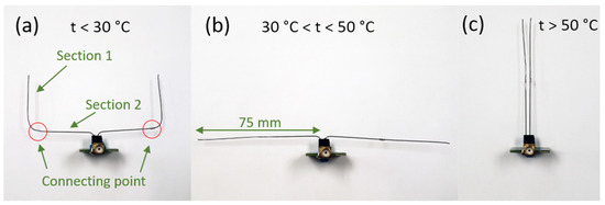 Moreover, the ShMoA shape tracks the peak temperature it experienced. Due to the hysteresis of the SMA, any temperature event will cause the shape of the antenna to change, and the shape is kept even after the temperature drops below the thresholds. In this paper, the 30 °C and 50 °C thresholds are chosen for demonstration. SMA wires of different temperature thresholds can be obtained by a specific material and dopant selection [50,51,52,53], and thus, one can program temperature thresholds. Note that the operating frequency is chosen to incorporate the widely used ultra-high frequency RFID band, which dictates the length of the antenna in the cm range. The TiNi alloy used in this work is a popular phase change material for MEMS applications [54]. Thin film sputtered TiNi has been extensively studied [55]. It is expected that smaller length of arms of the antenna will enable operation of ShMoA at higher frequencies with advantages of reduced dimensions of the overall antenna. For example, MEMS antenna in the dimension of around 10 mm will enable operation at 9.41 GHz [56], albeit with higher return loss.”