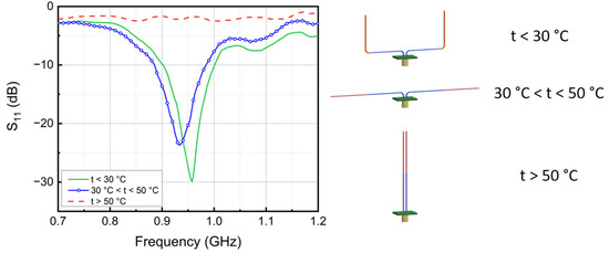 The measured frequency response of the ShMoA is shown in Figure 8. The ShMoA is in a U shape state when the temperature is below 30 °C, as shown in Figure 7a. Similar to the simulation results in Figure 3, the antenna in this state shows the largest reflection of 30 dB at 950 MHz. When the temperature is between 30 °C and 50 °C, the SMA sensor transforms into a dipole antenna, as shown in Figure 7b. As a result, the reflection coefficient S11 drops to 24 dB at 950 MHz. As the temperature rises above 50 °C, the SMA antenna turns into a parallel antenna, as shown in Figure 7c, and the S11 is less than 3 dB over the 0.7–1.2 GHz frequency range.