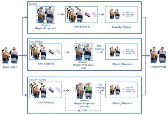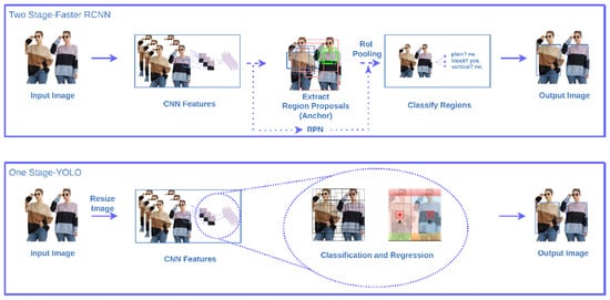 R-CNN, Fast R-CNN, and Faster R-CNN are typical two-stage detection algorithms, where the feature extraction and classification are two unique steps for object detection. In Figure 1, the concept of Regional of Interest (RoI) was proposed in Fast R-CNN such that the feature extraction can be more efficient. To further reduce the detection time, a Regional of Proposal Network was presented for Faster R-CNN. Due to the increase in architecture complexity, Faster R-CNN requires high efficiency computation capability for real-time object detection.