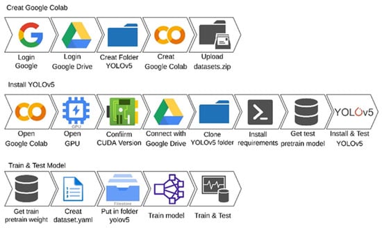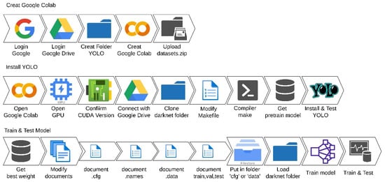 In this paper, one of the main concerns is to concisely demonstrate the essential steps to build a model training and testing environment on Google Colab. The authors sincerely hope that the guidance can help readers without the need for expensive computation supports. Based on the authors’ experience, the following comments could be helpful. For instance, while getting access to Google Colab, the selected GPU in the virtual machine must be enabled. Your own Google Drive is connected, and the file paths are correct. Furthermore, the version of each adopted software program like the operating system and framework must be compatible with each other. In the stage of building the YOLO dataset in the cloud environment, the self-defined storage path needs to be identified. The labelling outputs must meet the YOLO format. In practice, the filename of images (.jpg) and the labels (.txt) must be consistent. Furthermore, the user needs to install application programs according to the content shown in requirements.txt. To avoid careless mistakes, it is suggested that a small number of epochs is first chosen. After the correctness of all settings has been confirmed, a bigger number of epochs can be then used in the process of model training.