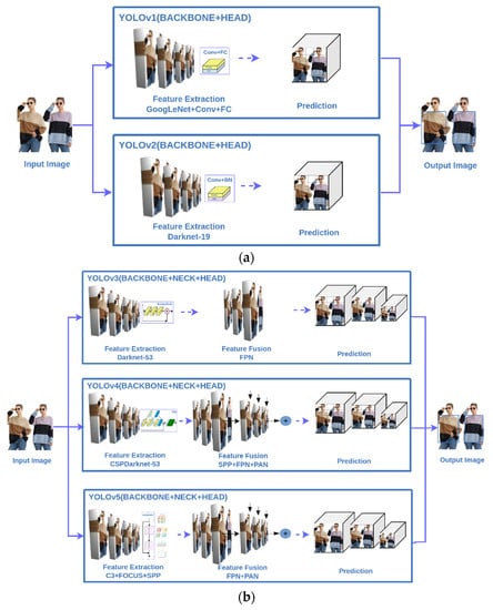 Architecture of YOLO: (a) YOLOv1~YOLOv2, (b) YOLOv3~YOLOv5.