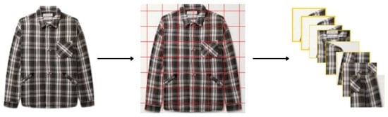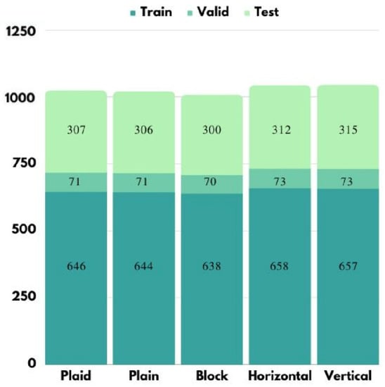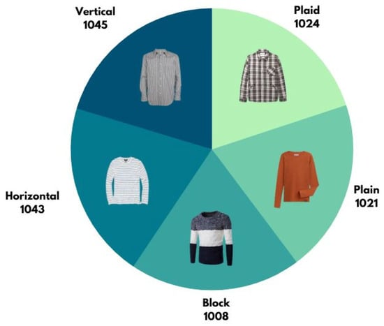 In this paper, the image datasets are collected from five open resources. For example, DeepFashion is a dataset of 50 classes fashion clothes, where the total number of images is over 80 million []. In addition, DeepFashion2 contains 49.1 million images of 13 classes of clothes []. Moreover, image samples are also collected from Google pictures and the sites of web fashion shops. The initial amount of clothing samples is 4455. With additional data augmentation, the number of total image samples used for this research is 5141, shown in Figure 8. The image samples are categorized into five groups: plaid; plain; block; horizontal; and vertical. In Figure 8, the number of each category is indicated, such as plaid having 1024 samples, etc.