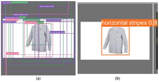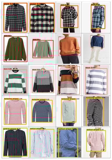 Recently, one-stage objection has attracted a lot of attention, such as YOLO and SSD []. The emergence of YOLO has greatly improved the speed of object detection. The application areas of YOLO are very wide. For example, in the medical field, related identification applications include cervical cancer [], blood cells [], colorectal cancer [], venipuncture [], etc., Applications also include the auxiliaries for hearing and visually impaired people [] and sign language identification []. Furthermore, due to the influence of epidemics, there were many mask identification studies based on the use of different algorithms [,,,]. There has been a lot of interest in self-driving cars such as automatic navigation [], driver’s assistance [], vehicle detection [], vehicle tracking [], and blind-spot detection []. The use of deep learning for target identification improves the accuracy of identification and also accelerates the speed of identifying targets. In the study of [], 42 different patterns of traditional clothes were considered, and the classification accuracy was higher than 90% by using convolutional neural networks. In [], VGG19 was used as the feature extractor to identify the Indonesia dress pattern. Faster R-CNN and some other convolutional neural networks were considered for the recognition of traditional handicraft weaving patterns. The results of the study showed that the accuracy of Faster R-CNN reached 82.14% [].