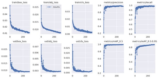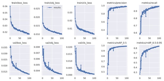 The YOLO Backbone is a convolutional neural network that pools image pixels to form features at different granularities. The Backbone in the deep learning architecture basically acts as a feature extractor. The Neck is a subset of the bag of specials, and it basically collects feature maps from different stages of the backbone. In simple terms, it is a feature aggregator. This is the part of the network that makes the bounding box and class prediction. The Head is also known as the object detector. Basically, the Head can be used to find the region where the object might be present, but with no information about which object it is. The corresponding outcomes are shown in Figure 12 and Figure 13. Furthermore, some testing results for the trained YOLOv5s model are shown in Figure 14. To validate the feasibility of the constructed YOLO learning architecture, some two- and one-stage learning algorithms are adopted for performance comparisons, as shown in Table 2 and Table 3. In Table 2, average precision (AP), mean average precision (mAP), model size, and frame per second (FPS) are addressed. The metrics of precision, recall, and F1-score are shown in Table 3. In the training and testing processes, the losses and performance metrics of each epoch are shown in Figure 15, where the number of epochs is 100. From the outcomes in Table 2 and Table 3, the YOLOv5s has better performance in all metrics of interest. Furthermore, the metrics in the training and testing processes of YOLOv5s with 300 epochs are shown in Figure 16. In Table 2 and Table 3, both the metrics for performance validations of YOLOv5s with 100 epochs and 300 epochs are included. Efficiency is generally improved with more epochs; however, the model size is slightly increased.