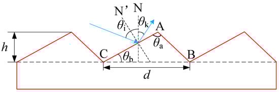 Wood [5] invented the “blazed” grating technique in 1910 to increase the diffraction efficiency of the grating. This technique alters the energy distribution of light at each diffraction order by altering the form of the grating groove. The grating can transfer spectral energy from the zeroth order to the desired order of the spectrum to achieve the “blaze” of the order if the grooved surface of the grating is not parallel to the grating’s normal, i.e., if there is a small angle θb (blaze angle, as shown in Figure 1) between the two. The wavelength corresponding to the maximum light intensity is the blazed wavelength. The design of the blaze angle permits the application of the grating to a specific order of the spectrum within a specific wavelength range. In Figure 1, N represents the grating normal, N’ represents the normal of the grating groove (i.e., the normal of the blazed surface), θi represents the angle of incidence of the light wave, and θk represents the angle of diffraction.