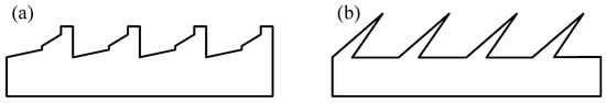 Scholars have also debated the spectral range effect of non-triangular groove gratings. Backlund et al. [34] of JPL used the optimal rotation angle method to create a convex grating (structured-groove grating) with a heterogeneous groove structure in 2004. The grating exhibits a pretty high and uniform diffraction efficiency distribution across the entire sunspot radiation spectral range (0.38–2.5 μm), as shown in Figure 3a. Zhang S et al. [35] examined the groove characteristics of an echelle grating with high diffraction efficiency and optimized the grating with a grating density of 79 line/mm by rigorous numerical simulations, and its structure is illustrated in Figure 3b. Although the structured-groove grating has a fairly high diffraction efficiency, it is also considerably more difficult to process.
