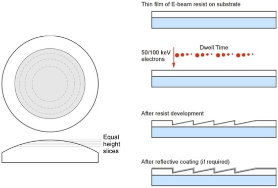 Electron beam lithography (EBL) is a type of micromachining that uses an electron beam instead of a mask to make high-resolution patterns on a substrate. Both convex and concave diffraction gratings are needed to make concentric imaging spectrometers. Direct-write electron beam lithography has been shown to be a good way to make highly efficient blazed gratings on surfaces that are not flat. At the moment, the Jet Propulsion Laboratory (JPL) in the United States is the only place in the world that can use direct electron beam writing to make high diffraction efficiency convex blazed gratings [28]. Fujita T [39] from Osaka University in Japan wrote about a way to improve the efficiency of blazed gratings by using electron beam lithography to make transmissive blazed gratings in polymethyl methacrylate films. Measurements showed that their first-order diffraction efficiency was only 60–70% at 0.633 μm. Using the JEOL JBX-9300FS electron beam lithography system with the process schematic shown in Figure 5, the Jet Propulsion Laboratory (JPL) has produced a relative efficiency greater than 90%, with diffuse scattering and ghosting of the main diffraction order less than 5 × 10−4 and a zeroth-order wavefront error less than λ/4 at a wavelength of 633 nm, at a writing rate of about 1~2 cm2 per hour, and the technique has been used to produce a compliant grating for the Mars Imaging Spectrometer (CRISIS) with flight requirements [40]. Maker P et al. [41] prepared convex single-angle blazed and double-angle blazed gratings using the electron beam method with good wavefront quality, and a PV wavefront error of 0.2λ was observed at 632.8 nm, which is comparable to that of holographic gratings. P. Mouroulis et al. [28] used electron beam etching to fabricate convex double-angle blazed gratings and applied them to the imaging spectrometer used by the U.S. New Millennium Earth Observation Mission EO-1 in the spectral range of 400–2500 nm.