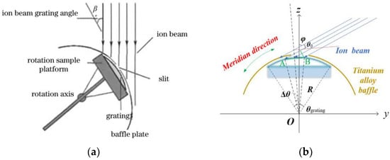 Due to the difficulty of making small blaze angle gratings with ion beam etching, Osterried [46] from Zeiss proposed a way to make planar blazed gratings by dip coating in 1998. Cheng Y [47] from Soochow University improved the traditional dip coating process and made a new type of dip coating device to make a convex blazed grating with a blaze angle of less than 4°. Haibin W [48] from Soochow University used Ar ion beam grazing incidence rotational scanning etching (oscillating etching method) to make a convex holographic grating with a size of 32.55 mm, a convex radius of 71.78 mm, an etched line density of 200 gr/mm, and a blaze angle of about 4.3°. By using holographic scanning ion beam etching, Liu Q et al. [49] made a convex blazed grating with a central period of 5 m, a blaze angle of about 4.3°, an etching area of 72 mm in radius, and an opening of 35 mm. Liu Q [50] also made a UV-VIS-NIR holographic double-blazed grating with a period of 833 nm using a modified holographic ion beam etching. He showed that when the two blaze angles of the dual-blaze grating were 10° to 12° and 26° to 32°, the first-order diffraction efficiency between 0.25 μm and 1 μm was more than 30%. Liu Q et al. [51] used rigorous coupled-wave analysis to study the diffraction efficiency of convex gratings (RCWA). The results showed that by controlling the blaze angle of convex gratings in the visible and near-infrared bands, the first-order diffraction efficiency can reach 40%. Above, a center period of 6.17 m, a blaze angle of about 2.9°, an antiblaze angle of about 21°, and a vertex angle of about 21° were made using holographic lithography-scanning ion beam etching technology. Experiments have shown that the first-order diffraction efficiency is more than 30% for a convex grating with a radius of about 156°, an etching area of 36.31 mm, and an aperture of 23.6 mm. At the blaze wavelength, the first-order diffraction efficiency can reach 62%. Shen C [52] from the University of Chinese Academy of Sciences made a convex blazed grating with a size of 67 mm, a curvature radius of 156.88 mm, an inscribed line density of 45.5 gr/mm, and a blaze angle of 2.2° using the holographic-swing ion beam etching method. Its peak diffraction efficiency is in the wavelength range of 900 nm–2500 nm. The ion beam etching method is shown in Figure 6.