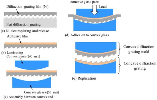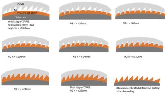 Horugavye G et al. [82] from the University of Liege, Belgium, reported a method to achieve diffraction grating replication on a convex substrate using a solvent vapor-assisted imprinting lithography (SVAIL) process with a convex grating size of 12.7 mm × 12.7 mm × 6 mm, grating density of 600 line/mm, blaze angle of 8°37′, and blaze wavelength of 500 nm, and the main steps of the SVAIL replication process are shown in Figure 9.