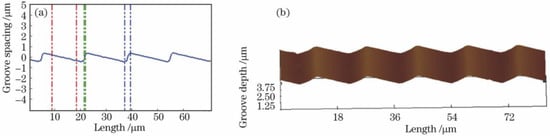 Atomic force microscopy’s contact mode is usually used to look at the profile integrity and blaze angle of convex blazed gratings [45]. Because the AFM has a small field of view, this measurement can only be done on convex gratings with a grating period of less than 100 μm. In studies [65,83], AFM was used to get a local profile of the grating, which is shown in Figure 10. This lets the grating period, blaze angle, and other parameters be measured.