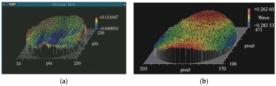 The phase difference of the grating diffraction wavefront determines the quality of the spectral lines and the resolution of the grating. The grating diffraction wavefront is often measured by comparing the actual wavefront to a standard plane or sphere. In the study [65], an interferometer (ZyGo, model VerifireTM) was chosen to test the quality of the grating surface using convex grating zeroth-order light. The test results are shown in Figure 11a, where the peak-to-valley (PV) value of the surface profile is 0.152λ and the root mean square (RMS) is 0.027λ where wavelength is 632.8 nm. The researchers in [84] used the Zygo interferometer to conduct an interference test on the zeroth-order diffracted light of the convex blazed grating and the surface error peak-valley value (PV) of the grating surface was 0.545λtest and the root mean square value (RMS) was 0.085λtest, among which the test wavelength λtest was 632.8 nm, as shown in Figure 11b.