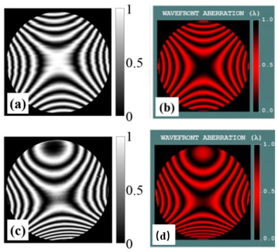 A phase-shifted Fizeau interferometer (Zygo Verifire) can be used to take direct measurements of diffraction wavefronts at different levels of diffraction [62]. To describe the quality of processing of convex gratings, the study [62] compared the expected interferograms from optical design software that simulates the test conditions with those obtained by direct wavefront measurement methods, as shown in Figure 12.