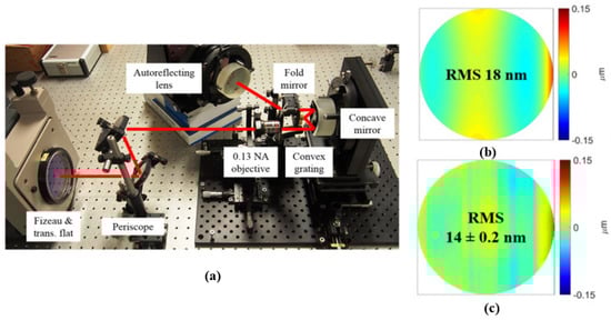 The nulling wavefront metrology method is detected using the experimental setup shown in Figure 13a, utilizing a concave spherical mirror placed concentrically with the convex grating substrate, which acts as an aperture diaphragm. The numerical aperture of the object of F/3.8 was chosen in the study [62] to match the numerical aperture of the designed imaging spectrometer. At the final zero position, 100 consecutive phase measurements were performed using a phase-shifted Fizeau interferometer [85]. To reduce the effects of vibration noise and air turbulence noise on the detection results, these measurements were then roughly split into five groups and averaged within each group. The calculated RMS of the nulling wavefront over these five data sets was 14 ± 0.2 nm. Figure 13c shows an example of one of these measurements, and the machined convex gratings were compared to the expected RMS of the nulling wavefront in Figure 13b to see if the design requirements were met.