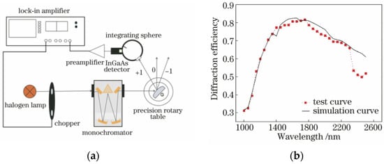 Figure 14. Test setup and curve for diffraction efficiency of convex grating. (a) Schematic diagram of the grating diffraction efficiency test setup [65]. (b) Convex blazed grating diffraction efficiency curve [65].