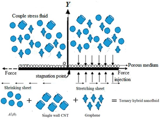 According to a study by Zhang et al. [] on thermal diffusivity and thermal conductivity, if a colloidal mixture of various nanofluids is generated by water conveying cylindrical and spherical nanoparticles, the normalized thermal conductivity of the cylindrical nanoparticles increases. Furthermore, water transporting CNT nanoparticles has a far higher thermal conductivity than nanofluids carrying spherical nanoparticles. Wakif et al. [] explored the internal heating of spatially homogeneous and non-uniform nanofluids. Narayana et al. [] studied an unstable MHD nanofluid subjected to non-uniform heat generation and absorption. Many equations have been proposed for to nanofluid fluid movement across porous media. The formal structure of issues regarding a porous medium was suggested by Darcy and Brinkmann [,]. Anuar et al. [] studied the heat transfer of carbon nanotubes over an exponentially stretching/shrinking sheet using suction and the slip effect. Anwar et al. [] investigated the unsteady MHD flow of Jeffery fluid flow using wall velocity and Newtonian fluid. The fluid flow and heat transfer of carbon nanotubes, along with a flat plate with a Navier slip boundary, were investigated by Khan et al. []. Shalini et al. [] studied the unsteady MHD chemically reacting mixed convection nanofluid flow past an inclined pour stretching sheet, using the slip effect, as well as a variable thermal radiation and heat source The MHD flow of a Jeffery fluid with mixed convection on a porous medium was investigated by Yana et al. [] using a radiative heat flux stretching/shrinking surface. Stokes is recognized for developing the concepts and equations for pair stress fluid flows, which is another important point to make. The governing equations are provided for an incompressible pair stress fluid flow with conservative body forces. Some insights regarding these ideas can be found in refs. [,].