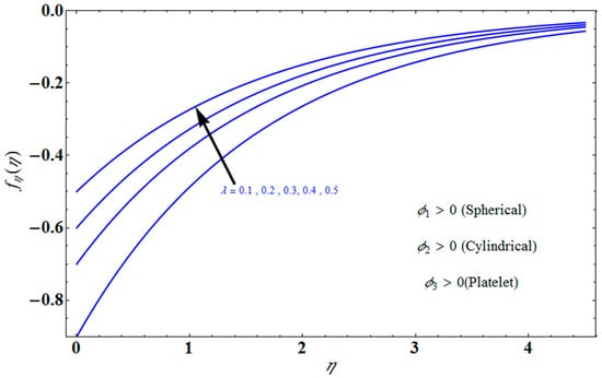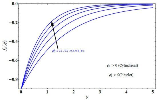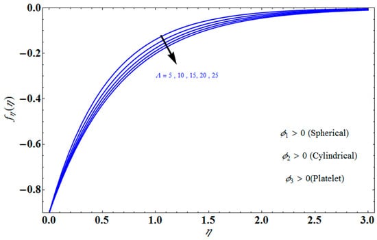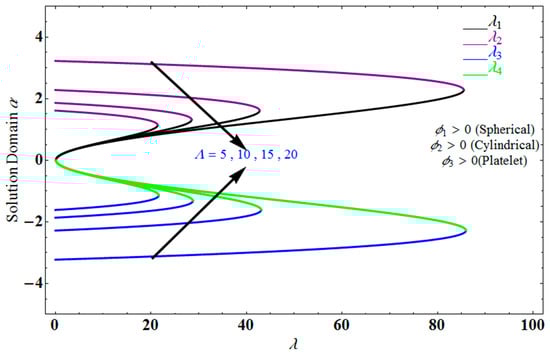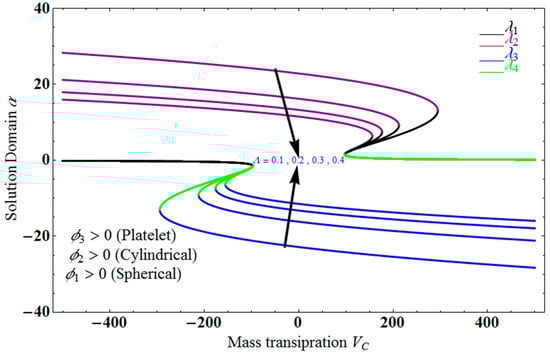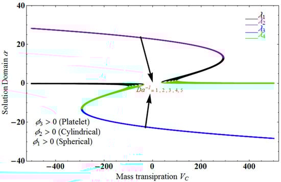 Figure 2 depict the impact of solution domain on mass transpiration with various values of couple stress parameters for the stretching sheet. In this graph, we can see the results of four roots . are were found on the x-axis, whereas were on the positive y-axis. These four roots are completely contrary to one another. For the roots , it can be seen that the solution domain is greater for higher values of couple stress. However, when the couple stress parameter values increase in the roots , then the solution domain decreases. The results of a modeling of dispersion water with three different types of nanoparticles are water-Al2O3/single wall carbon nanotubes/graphene when and the other parameters remain constant. Similar effects apply in Figure 3 for different parameters, such as the inverse Darcy number.