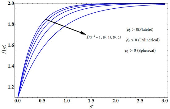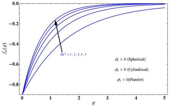 Figure 4 depicts the impact of solution domain on with various values of the couple stress parameter. In this graph, we can see the results of the four roots . were found on the x-axis, whereas were on the positive y-axis. These four roots are completely contrary to one another. For the roots it can be seen that solution domain is greater for higher values of couple stress. However, when the couple stress parameter values increase in the roots then the solution domain decrease. Figure 5 represents the effect of on for different values of the couple stress parameter for the stretching surface, keeping other parameters constant. When couple stress parameter increases, the thermal boundary decreases. In fact, the force and impact of the boundary conditions override the couple stress parameter in the case of stretching sheets. An increase in the value of the couple stress parameter causes a comparable rise in the axial velocity profiles in the case of both porous stretching and shrinking. The boundary layer becomes thinner when non-Newtonian viscoelastic shear stress occurs. Additionally, the boundary layer is smaller when suction, as opposed to injection, is utilized. Figure 6 represents the effect of on for different values of the inverse Darcy number for stretching surface, keeping the other parameters constant. When the Darcy number increases, the thermal boundary decreases. The inverse Darcy number, as previously stated, is an attractive body force whose projection on the x-axis is situated in the opposite direction of x. Therefore, a higher inverse Darcy number value will result in more resistance to the axial velocity, thus reducing it. On the other hand, for a stretching sheet, the magnetic field and the imposed boundary condition are both in the same direction and will reinforce one another. Figure 7 represents the effect of on for different values of couple stress parameter for the stretching surface, keeping other parameters constant. When couple stress parameter increases, the thermal boundary decreases. Figure 8 represents the effect of fη(η) on for different values of mass transpiration for the stretching surface, keeping other parameters constant. When mass transpiration increases, the thermal boundary decreases. The noticed increase in influence is due to the dimensionless number’s simple index of the ratio of thermal resistances within the fluid, and at its surface, the mass transpiration is only significant close to the wall. Figure 9 represents the effect of on for different values of for the stretching surface, keeping the other parameters constant. When increases, thermal boundary increases. Figure 10 represents the effect of on for different values of the Darcy number for the stretching surface, keeping the other parameters constant. When the Darcy number increases, the thermal boundary increases. In fact, the BC’s power and influence are more significant while stretching a sheet, unlike the results for the fluids. Similar results are obtained by increasing the size of the Darcy number. Axial velocity profiles in the case of both mass transpiration parameters and stretching/shrinking increase. The dividing mass transpiration in the stretching/shrinking sheet causes the layer to narrow.