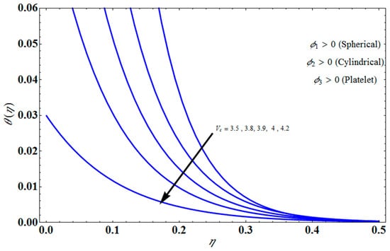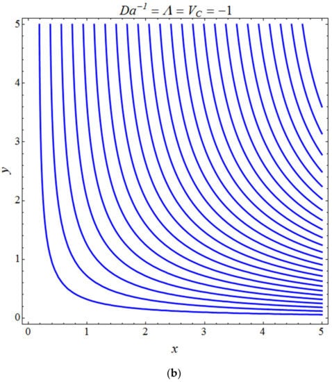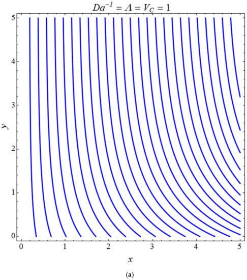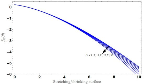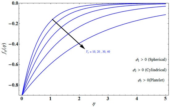 Figure 11 represents the effect of on for different values of volume fraction for the stretching surface, keeping the other parameters constant. When increases, the thermal boundary increases. The ternary hybrid nanoparticles within the nanofluid increase as the volume fraction of the nanoparticles increases, allowing for an increased area for improved heat conduction. As can be seen in Figure 11, this raises the velocity of the nanofluid. Figure 12 shows the impact of on for various values of for the stretching surface. decreases with an increase the value of , and it is observed that the boundary layer thickness also reduces in the stretching surface. Figure 13 indicates the impact of on for various values of the Biot number for the stretching case. Here, it seen that decreases as the value of the Biot number increases. As a result, the Biot number enhances the thermal diffusivity of a nanofluid for rising quantities of Bi. The nanofluids are increase in the efficiency of the Bi as the temperature rises. The performance of nanofluids is affected by both the drop in particle volume fraction and the increase in temperature in the flow pattern. Figure 14 show the temperature distribution versus the similarity variable for various values of the mass transpiration Vc for the stretching surface. This means that the thickness of the thermal boundary layer under suction is thinner than under blowing. Figure 15 show the temperature distribution versus the similarity variable for various values of the thermal radiation NR for the stretching surface. Thermal radiation, therefore, increases the thermal diffusivity of nanofluids; for emerging radiation parameter values, heat will be added to the regime, and temperatures will rise as a result. A fluid temperature greater than both the wall temperature and the surrounding ambient temperature is technically possible, as was mentioned for the heat transmission of flows over a stretching sheet. Here, we have discussed the effect of forced flow over a stretching sheet; we now look at heat transport in the presence of radiation. The effect of heat conductivity is amplified by the radiation. Radiation has the effect of dampening or enhancing heat transmission in a linear manner. Figure 16a,b show the streamline flow patterns for suction and injection situations, respectively. For suction and injection scenarios, we look at different line patterns. The streamline flow pattern for the stretched boundaries is shown in Figure 16a,b for varied levels of mass transpiration Vc while other parameters remain constant. When wall suction occurs at specific locations, as predicted by the physical theory, the flow field becomes regularized. On the other hand, blowing (flow injection) eliminates the streamline in the circular shape. Figure 17 indicates the effect of the skin friction coefficient on the stretching/shrinking surface as a function of couple stress , respectively. Here, it is noticed that the couple stress parameter is the reciprocal of thickness decreasing of the boundary layer occurs via the same process. While skin friction is linearly proportional to the thickness of the boundary layer, it is estimated to have an inverse proportionality , as depicted in Figure 17. In addition, upward pulling couple stress parameters will draw fluid toward the negative y direction and reduce skin friction. The thickness of the boundary layer will decrease when the suction parameter, which measures the strength of wall suction, is increased, and as a result, the gradient of the velocity on the wall will also increase. This impact will enhance skin friction, as shown in Figure 17. Figure 18 shows the effect of the skin friction coefficient on couple stress as a function of the stretching/shrinking surface , respectively. Here, it should be noted that the process of the decrease of the boundary layer’s thickness and the stretching/shrinking surface parameter are the same. Skin friction is thought to have an inverse relationship with boundary layer thickness, as shown in Figure 18, even though the two are linearly proportional . Additionally, fluid will be drawn toward the negative y direction, and the skin friction will be decreased by the upward pulling couple stress parameters. The suction parameter, which gauges the strength of the wall suction, causes a reduction in the thickness of the boundary layer, which causes an increase in the gradient of velocity on the wall. The increase in skin friction caused by this collision is depicted in Figure 18.