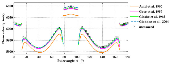 The experimental results for the SAW phase velocities in Al2O3(1-102) were then compared with the results of calculations performed with the semi-analytic Greens function method. Input data for these calculations are the sets of elastic moduli listed in Table 3. For the density of sapphire, the value ρ = 3982 kg/m3 [31] was used, and for the dielectric constants we used the values = 9.34 and = 11.54 [33] in all our calculations. The off-cut angle of 3° was accounted for. It was found that the set of elastic constants reported by Gladden et al. [27] and also the constants provided by Gieske and Barsch [30], the latter after correction of the sign of c14, fit best to the LU data and lead to very good agreement between calculated and measured phase velocities. A comparison of calculated phase velocities with three different input sets and measured values as functions of wavevector direction is provided in Figure 5.