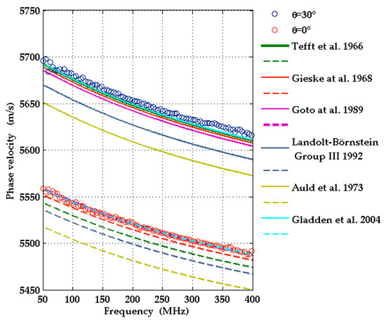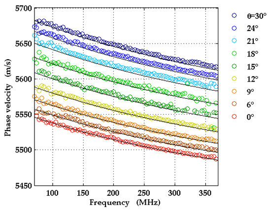 The symmetry of the c-plane geometry implies that [0°, 30°] is an irreducible interval of angles θ for the SAW wavevector directions. LU measurements were taken for nine different wavevector directions corresponding to angles θ in this interval. For each direction, the SAW pulse shapes were recorded at 32 different distances from the source. From these data, the SAW dispersion curves were determined in a frequency range from 50 up to 400 MHz, shown in Figure 9. They exhibit a small, but non-negligible curvature.