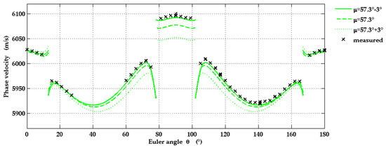 Figure 8 shows calculated SAW phase velocities for the correct off-cut angle χ = −3° and four additional values of χ. The experimental data for the phase velocities shown in this figure are downshifted by 3 m/s as an attempt to correct a systematic error in our measurements due to a misalignment between the pump beam and the moving direction of the translation stage mentioned in Section 2.3.