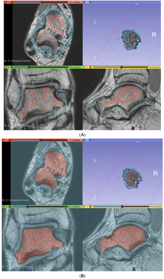 Bony foot and ankle anatomy and associated musculature was successfully segmented from a high-resolution MRI dataset. However, this was a time-consuming process due to the inaccuracy of semiautomatic segmentation processes and the consequent heavy reliance on manual paint and erase tools. Such extensive use of manual tools may have also introduced bias through personal interpretation and creation of the appearance of virtual models. Reproducibility of this method may have also been limited, since the outcome is likely dependent on the observer. This predisposition to potential bias could be overcome in future through the use of automated segmentation algorithms and plugins, such as those involved in machine learning or deep learning tools for rapid and efficient segmentation processes [27,28,29]. However, at present, there is a distinct lack of available plugins designed specifically for segmenting musculoskeletal MRI datasets. Further exploration and developments are required to create tools applicable to MRI datasets of the musculoskeletal system.