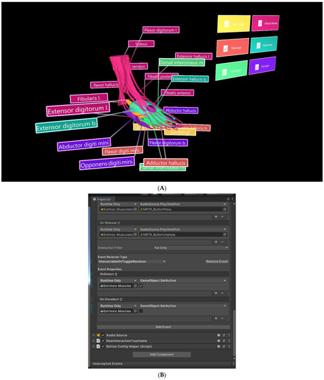 The segmented muscle objects were exported in groups—extrinsic muscles, dorsal layer, and first, second, third, and fourth plantar layers—in object file (.OBJ) format and imported into Unity 3D (V2020.3.26[LTS], San Francisco, CA, USA). Each muscle group was assigned a different colour to improve distinguishability, with six “PressableButtonHoloLens2ToggleCheckBox_32 × 96” from the “Mixed Reality Tool Kit Foundation Package” [18] used as toggle switches for selectively displaying each muscle group (Figure 7). In the inspector panel, the actions of engaging and disengaging the toggle switches were assigned the default sounds “MRTK (Mixed Reality Took Kit)_ButtonPress” (Microsoft, version: 1.0.2209.0, Redmond, DC, USA) and “MRTK_ButtonUnpress” [18], respectively. To display and hide muscle layers, event properties were adjusted for each toggle switch, as displayed in Figure 7A. Tooltips from the MRTKFoundation Package were also used as labels to identify each muscle.