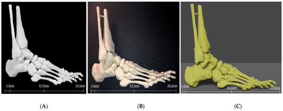 Three-dimensional printed models of foot and ankle bony anatomy in white acrylic resin (A) using Formlabs 3D printer (Massachusetts, USA) and TPU (B) and PLA (C) using Ultimaker 2 Extended 3D printer (Ultimaker BV, Geldermalsen, the Netherlands).