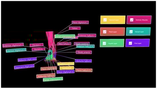 Muscle objects imported into Unity 3D for demonstration of different groups/layers. Toggle switches and colour-coded extrinsic muscle group (magenta), dorsal layer (light blue), and first, second, third, and fourth plantar muscle layers.