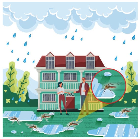 The history of the dengue virus in the human population is not known because the dengue virus is asymptomatic, and the diagnosis of such diseases is difficult [1]. In 992 BC, the Chinese medical encyclopedia recorded the earliest data of the dengue virus [2]. At the end of the 18th century, there were other epidemic diseases in America and Asia. These epidemic diseases were very similar to the dengue virus. Therefore, based on these observations, the hypothesis is presented that the dengue virus spread in the human population in the middle of the 19th to 20th century [3]. Humans are infected by the dengue virus through a mosquito bite. One of the families of mosquitoes Aedes aegypti spread this virus, and female mosquitoes transmitted the dengue virus through their bites [4]. The dengue mosquitoes have a very short life, but as their eggs are converted into larvae, on average from 4 to 10 days, they spread the dengue virus [2,5,6]. The most favorable temperature for their breeding is 30 C. The dengue outbreaks are enhanced if there is rainfall at a high temperature [7]. Dengue fever presents symptoms such as body pain, nausea, vomiting, severe headache, and many more [4,8]. At the early stage of dengue fever, it has the same symptoms as common fever, but these symptoms become intense as time passes. There are four types of dengue virus, DENV1, DENV2, DENV3, and DENV4 identified to date [5]. In countries like Pakistan, the rate of dengue virus spread is very difficult to control because of poor drainage and solid wastes systems. In Pakistan, the monsoon period starts from July to October; during this period, there are heavy rains, and most populated areas are badly affected by floods. As there is an obsolete system of flood control and drainage system, there is a high risk of water diseases, such as dengue and malaria [9]. The spread of the dengue virus is directly linked with monsoon rainfalls in Pakistan, as this country receives heavy rainfalls annually in this season, and due to poor drainage systems and infrastructure, most cities are heavily affected by the flood [9]. Aedes mosquitoes easily breed in stained water, and this ideal environment is provided on rooftops and water containers where stained water gathers after each episode of rainfall [9]. In 2010, there was a heavy rainfall resulting in floods in Pakistan, which directly affected 14–20 million people in different cities [10]. As a result of these floods, Aedes mosquitoes had a highly favorable environment for breeding, resulting in an enormous increase in cases of dengue virus [11]. Until then, these were the highest recorded cases of the dengue virus in Pakistan. These rainfalls are one of the most important factors for dengue virus spread as shown in Figure 1 [12].