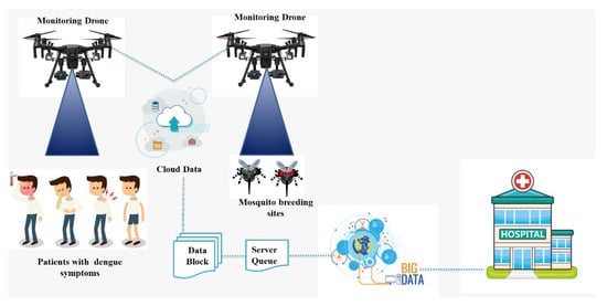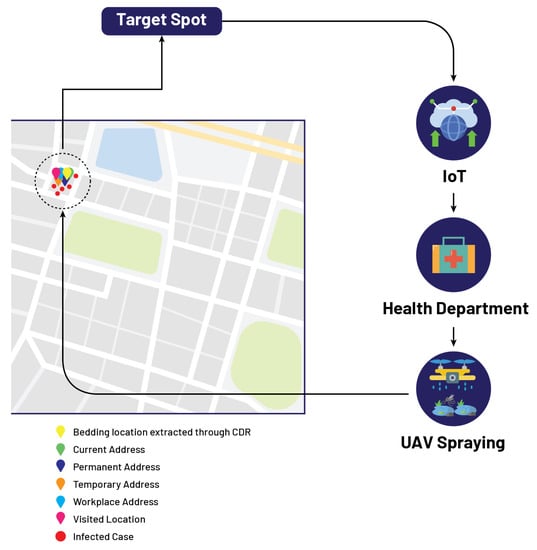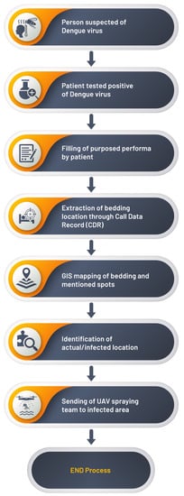 To locate dengue-infected patients, a geographical position-based model is needed to control or minimize the spread of the dengue virus. To achieve the required model, the patient location can be tracked by using his or her call history and the base station from where the patient mobile receives and send signals. Once the patient location is tracked, the dengue virus spread can be controlled or minimized by spraying the infected area with the help of UAVs, isolating, and monitoring the infected dengue virus patient. If this infected patient is ignored at the initial stage, it will result in the spread of the dengue virus drastically. The CDRA algorithm will be used to locate or track the infected patients by monitoring their call history to control the spread of dengue virus. This algorithm can be easily implemented. By using CDRA, after the patient location is tracked, a spray team will be informed to spray the infected location using UAVs. Our proposed model can minimize or control dengue virus outbreaks. A flowchart of our proposed model and the CDRA (IoMT, UAV, GIS and Cloud) framework graphical abstract is shown in Figure 2 and Figure 3, respectively.