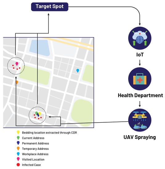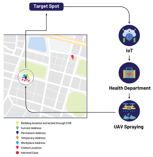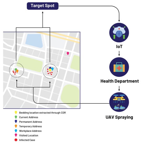 Let us assume that an infected patient, named Mr. A, fills the performa by providing the attributes such that his current address, permanent address, temporary address, workplace address, and visited address all are the same location as shown in Table 4. In this case, as all addresses show the same location, the government authority receives information about the infected location from the cloud, and now the department of concern is responsible for sending spray drones to the identified location on the GIS mapping as shown in Figure 4.