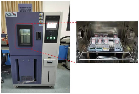 EMC strips with of 30 mm × 8 mm × 0.8 mm (length × width × thickness) in size were prepared for hygroscopic tests. According to JEDEC J-STD-020E [], the samples were baked in an oven at 125 °C for 24 h to minimize the effects of residual moisture and obtain the dry weights before tests. Subsequently, the samples were tested in a temperature and humidity chamber (CHTH4005, temperature range: −40 °C–150 °C, humidity range: 10–98% RH) at two different hygrothermal conditions: 85 °C/85% RH and 60 °C/60% RH for 50 h (Figure 1). Five samples were tested for each condition to obtain more reliable results. Samples were weighed with a high-precision electronic balance (accuracy 0.1 mg) before hygroscopic tests, and every 4 h after the tests started.