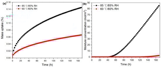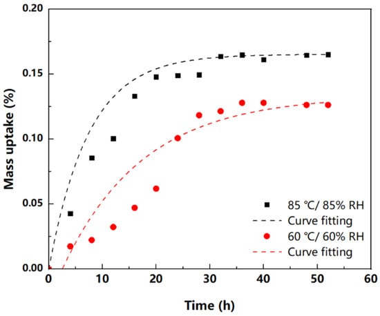 Figure 3 shows the average mass increases in EMC at 85 °C/85% RH and 60 °C/60% RH. For both conditions, the weight increases were faster at the beginning of tests, but generally stabilized when the tests lasted for longer than 35 h. Although different diffusion models have been proposed for moisture diffusion [,,,], Fick’s law is still the most common theory used for data analysis [,], which was also employed in our study.