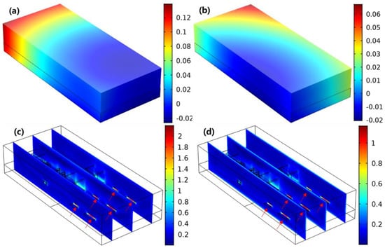 Figure 5a,b show the comparison of out-of-plane deformation within the module after subjected to 85 °C/85% RH and 60 °C/60% RH for 168 h. It can be found that the warpage at 85 °C/85% RH (0.14 mm) was more severe than that at 60 °C/60% RH (0.07 mm). In addition, the shape at 85 °C/85% RH was slightly different from that at 60 °C/60% RH with different locations of minimum deformation along the Z axis. Figure 5c,d illustrate the stress distribution within the module. It is shown that the stress was generally concentrated at the chips, and the maximum stress at 85 °C/85% RH (219 MPa) was much higher than that at 60 °C/60% RH (117 MPa).
